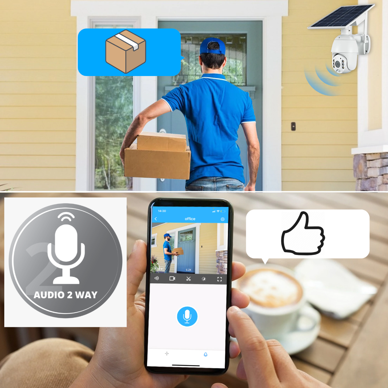 Urządzenie posiada mikrofon oraz głośnik, co umożliwia dwustronny przesył audio przez urządzenie. Więc możesz je również wykorzystać jako "VIDEODOMOFON" i w dodatku zdalnie - z każdego miejsca na świecie - sterując tylko smartfonem!